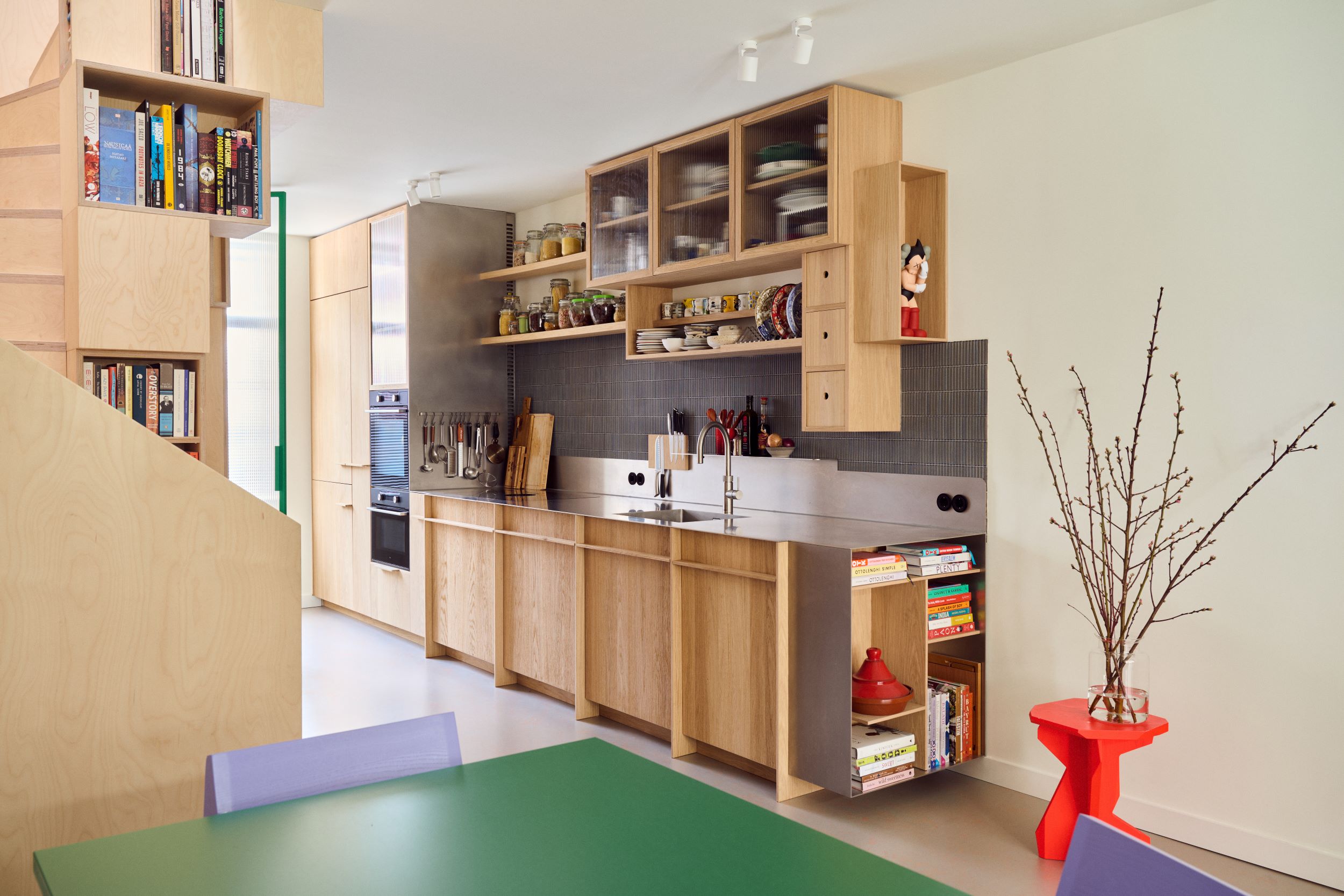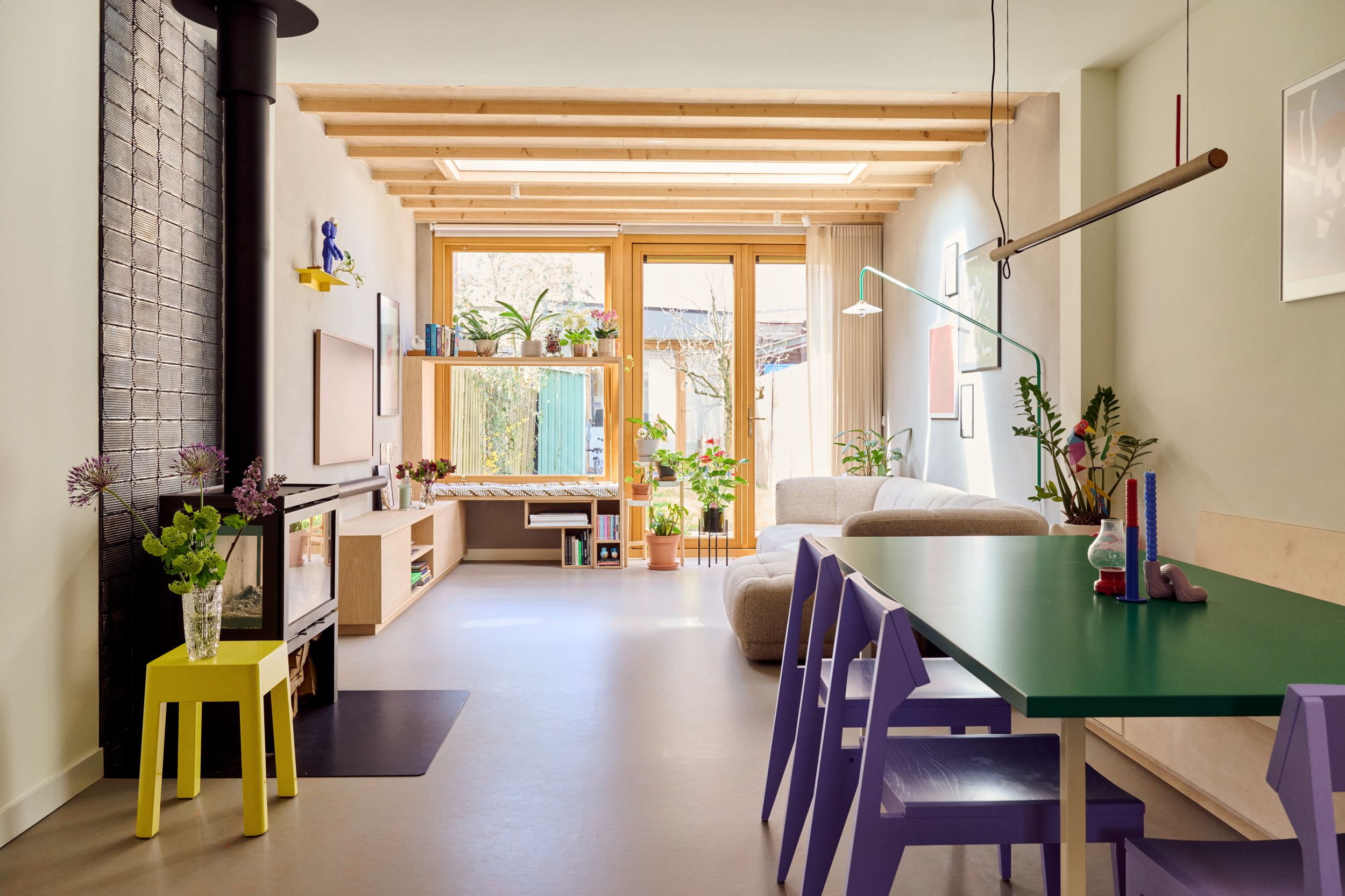 Door nauwe samenwerking met de klanten, die een gedurfde en fantasierijke ontwerpvisie omarmden, werden waar mogelijk natuurlijke materialen gekozen, waarbij berken multiplex - een favoriet van de opdrachtgever - centraal stond. Dit veelzijdige materiaal vormt een centrale ontwerptaal, verwerkt in belangrijke elementen zoals de trap, toilet en open kastruimte. In contrast hiermee staan op maat ontworpen elementen, waaronder de keuken, tv-meubel en een gezellige zithoek, die doorloopt in een groot raam dat een directe verbinding biedt met de tuin.