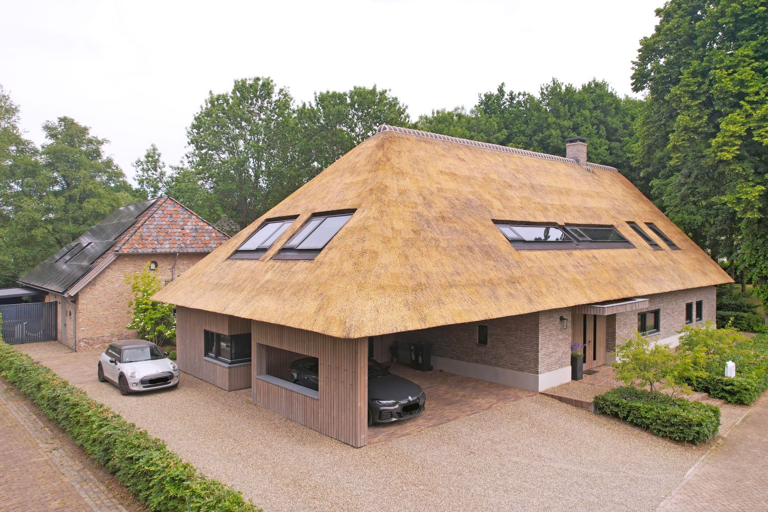 De boerderij uit 1806 sluit nog steeds aan op de landelijke omgeving met sloten en smalle wegen, terwijl de brede carport aan de zijkant een moderne uitstraling heeft en ruimte biedt voor meerdere auto’s. De ‘achterom’ maakt het mogelijk om eenvoudig naar de tuin of het bijgebouw te lopen, zonder door de gehele woning te hoeven.