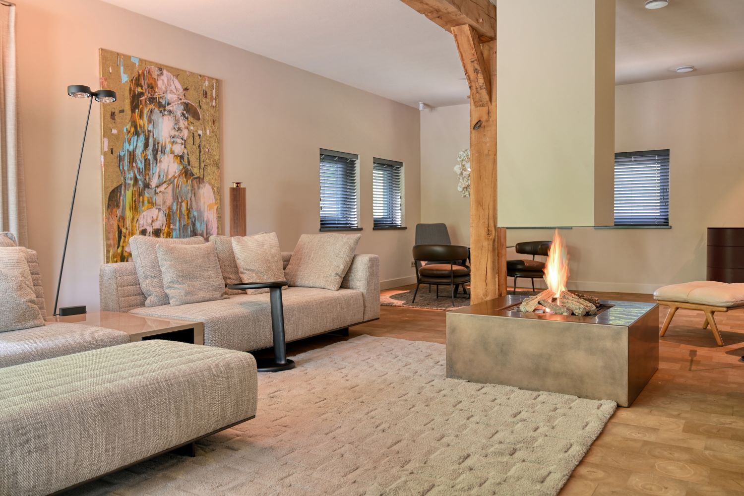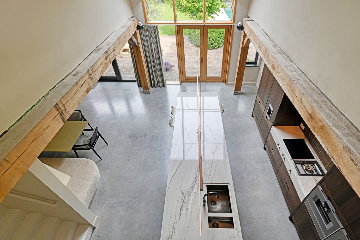 Het bijgebouw combineert moderne en historische elementen, met een glazen wand en behouden houten deuren. Hier is een huiscafé ingericht en de ruime kelder biedt voldoende bergruimte, waardoor functionaliteit en comfort hand in hand gaan. De keuken vormt het hart van het huis, met een grote vide en houten latten die doorlopen tot boven de overloop, waardoor eenheid ontstaat tussen beneden en boven. Het interieur is zo ontworpen dat er vanuit vrijwel elke hoek visueel contact is met de achtertuin, waardoor de leefruimtes licht en ruimtelijk aanvoelen. De woonkamer is warm en uitnodigend, met een losstaand haardmeubel en een open opstelling die interactie tussen gezinsleden stimuleert.