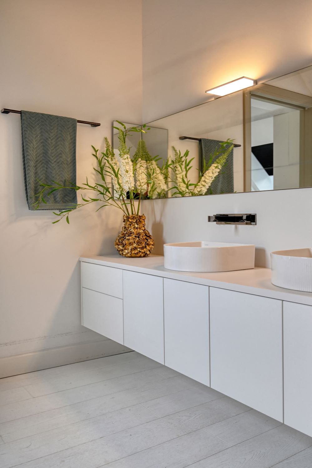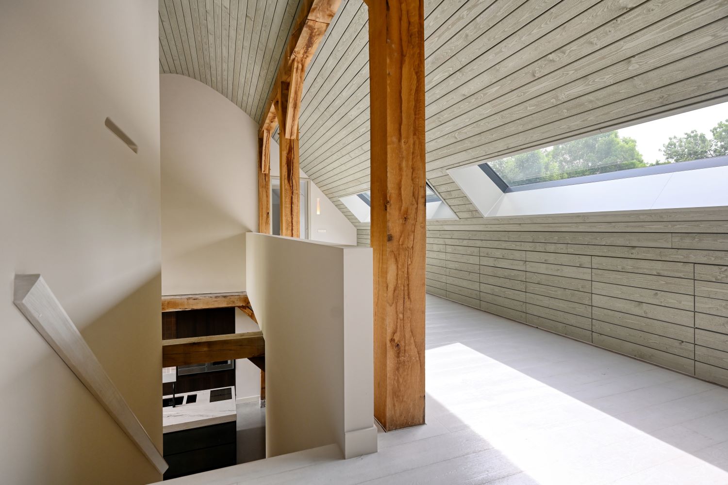 De slaapvleugel en overloop vormen één samenhangend geheel met de rest van de woning. Doorlopende plafonds, afgestemde kleuren en gedetailleerde afwerking creëren een gevoel van harmonie, waarbij iedere ruimte zijn eigen identiteit behoudt. De brede overloop verbindt de slaapkamers en biedt extra lichtinval door grote ramen, waardoor een gevoel van openheid en vrijheid ontstaat